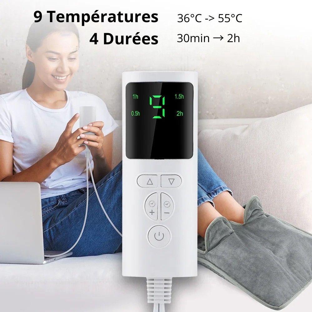 Le chauffe-pieds électrique innovant s'adapte parfaitement à votre rythme de vie quotidien. Grâce à ses 9 réglages de température personnalisables et sa minuterie intelligente avec 4 options temporelles, vous contrôlez précisément votre confort thermique.